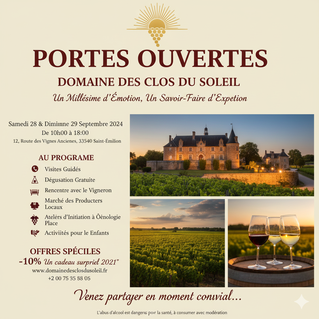 Journées portes ouvertesLe domaine vous ouvre ses portes à l’occasion de ses journées portes ouvertes.Au programme : dégustation de nos